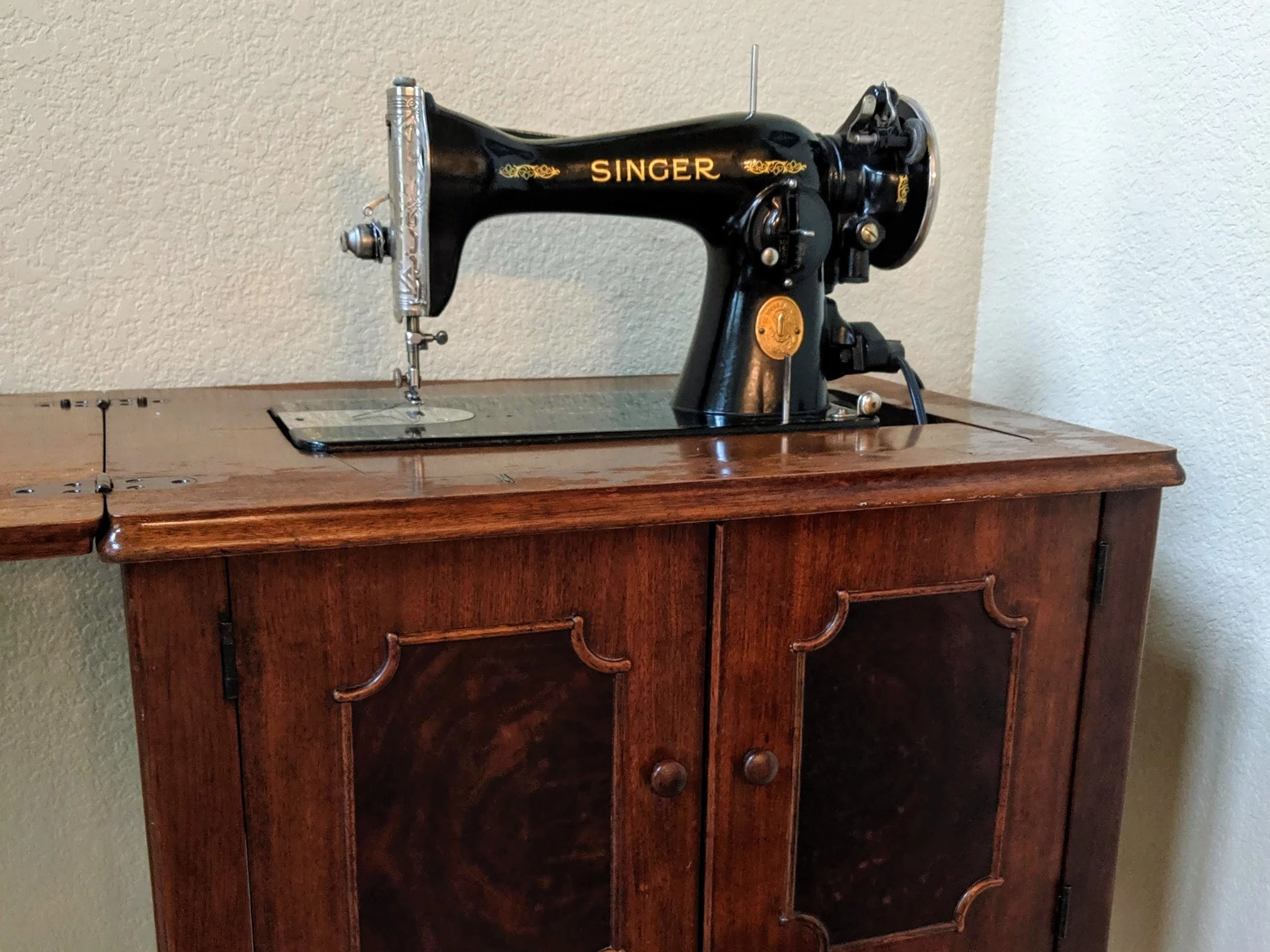 This beautiful vintage sewing machine is a 1934 Singer 15-91. The machine folds down into the cabinet. It is electric and operated with a knee lever.